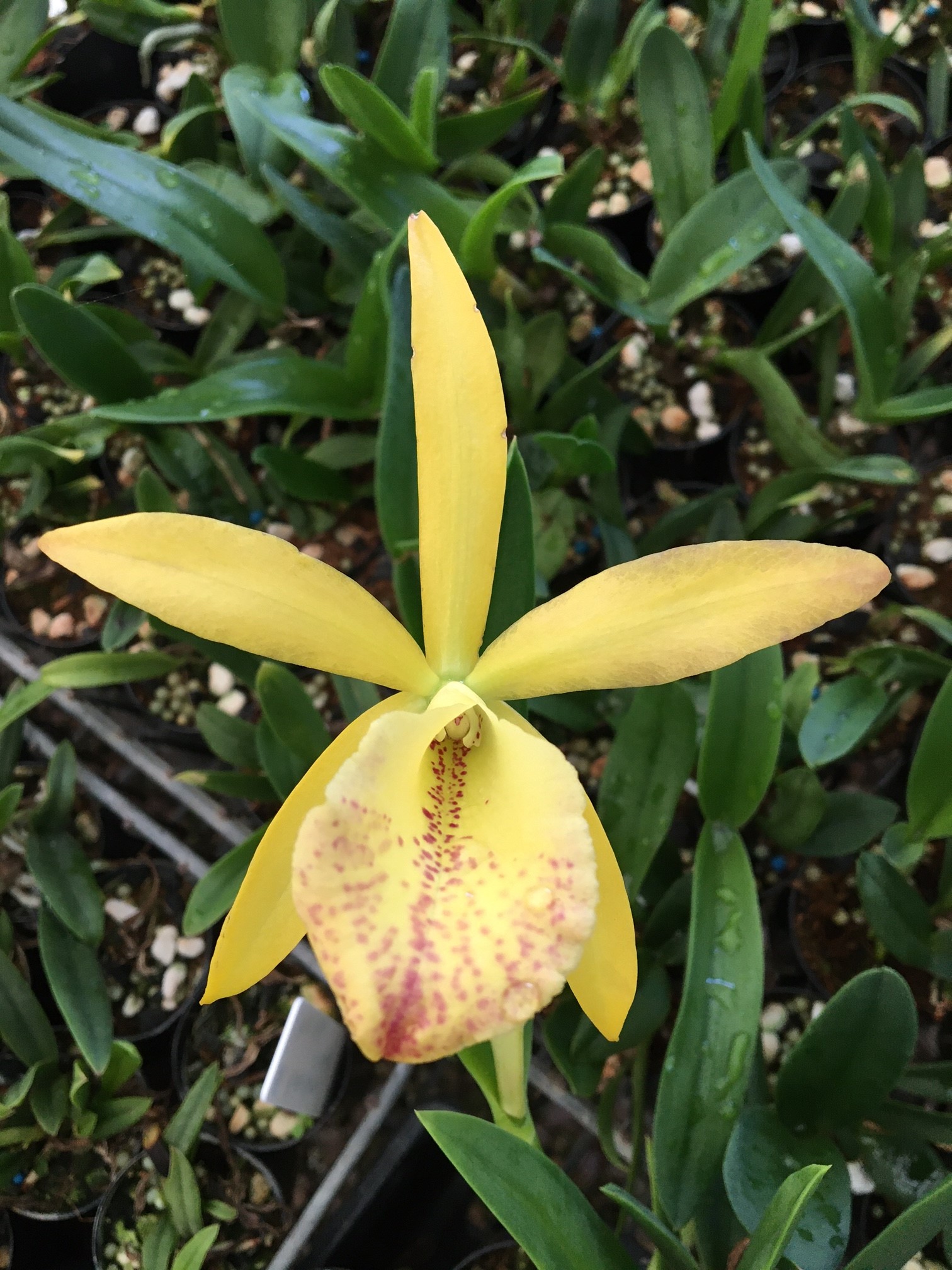 B. nodosa hybrid with star shaped yellow flowers with a broad spotted lip.