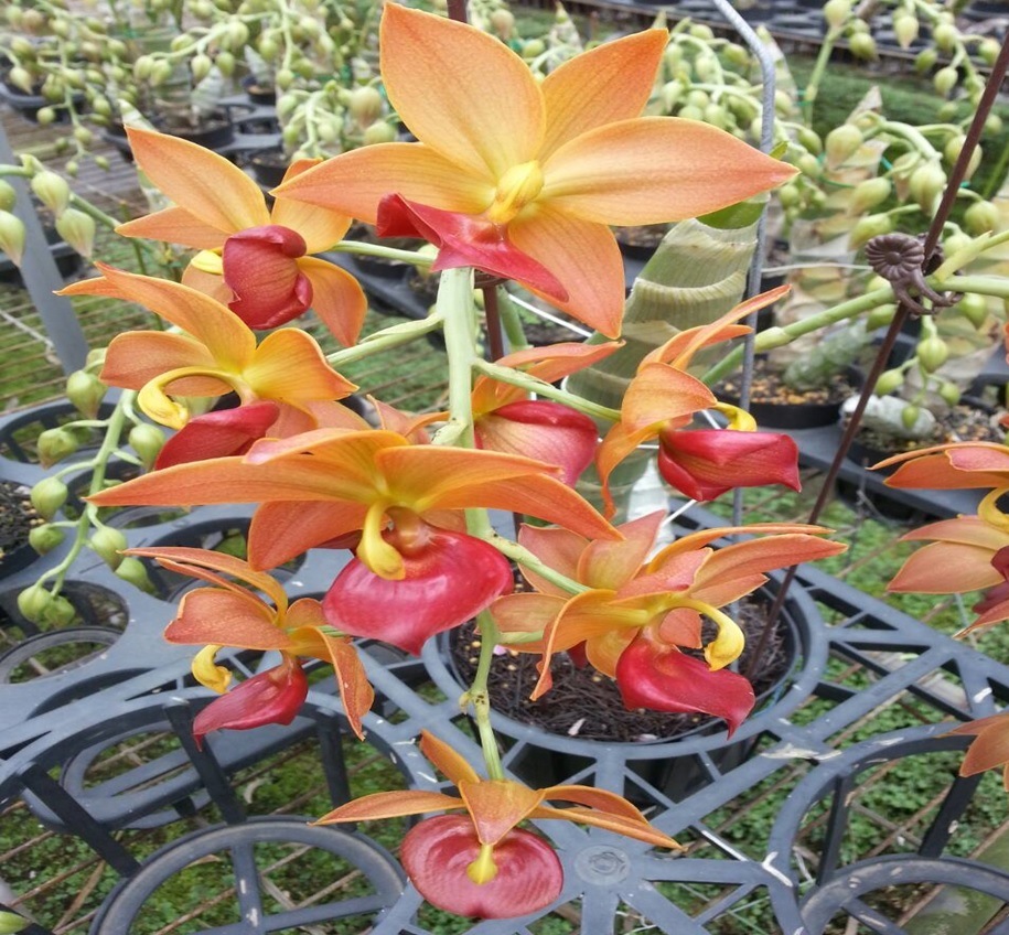 Re release of this stunning Cycnoches with long pendulous spikes of deep orange with the red labellum. Nice bulbed up tubes.